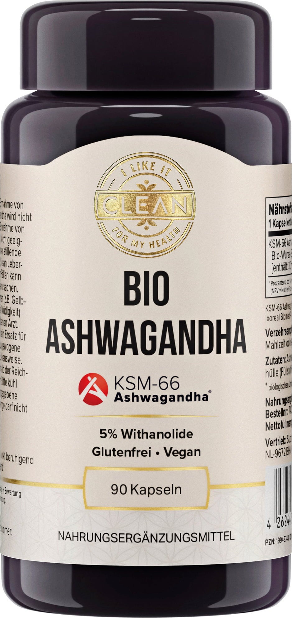 Mit dem Ashwagandha Bio Wurzel-Extrakt 600 mg von i like it clean bekommst du hochwertigen Bio-Ashwagandha-Extrakt aus kontrolliert ökologischem Anbau. Der Markenrohstoff KSM-66® liefert das volle Spektrum der Ashwagandha-Wurzel in geprüfter Reinheit – mit einem standardisierten Gehalt von 5 % Withanoliden. Frei von Gentechnik, glutenfrei und in einer pflanzlichen Kapselhülle verpackt, passt dieses Produkt perfekt in eine bewusste Ernährung.