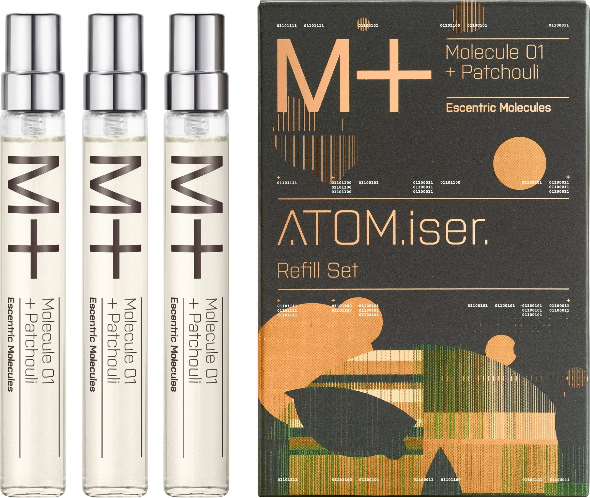 The Molecule 01 + Patchouli ATOM.iser Refill Set by Escentric Molecules consists of 3 eaux de toilette for refilling the ATOM.iser, a luxurious, handy travel case.